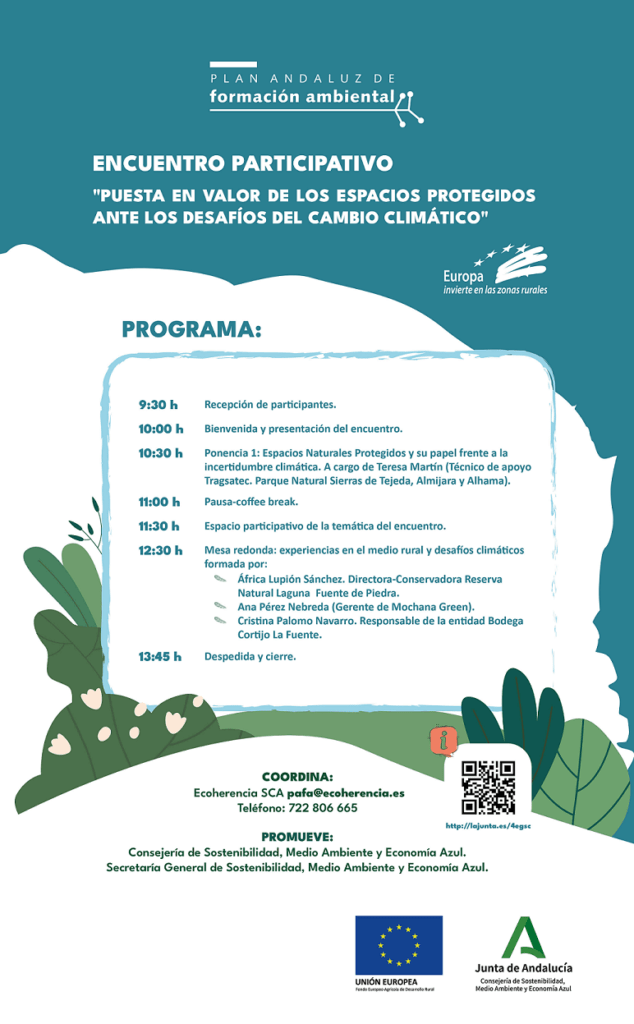 Se trata de un espacio dedicado a conocer la actualidad en materia de conservación y gestión de Espacios Protegidos de Andalucía y cómo trabajar ante los desafíos del cambio climático. Conocerás a otras personas con intereses comunes y experiencias inspiradoras sobre emprendimiento, investigación y nuevas tecnologías.
