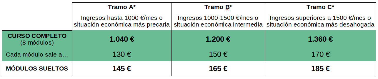 * La elección de tramo es individual y confidencial entre la persona inscrita y la organización. Los criterios indicados son orientativos, no pedimos justificación. Optamos por este planteamiento como un ejercicio de corresponsabilidad, compaginando la viabilidad económica del curso con hacerlo accesible a personas en distintas circunstancias.